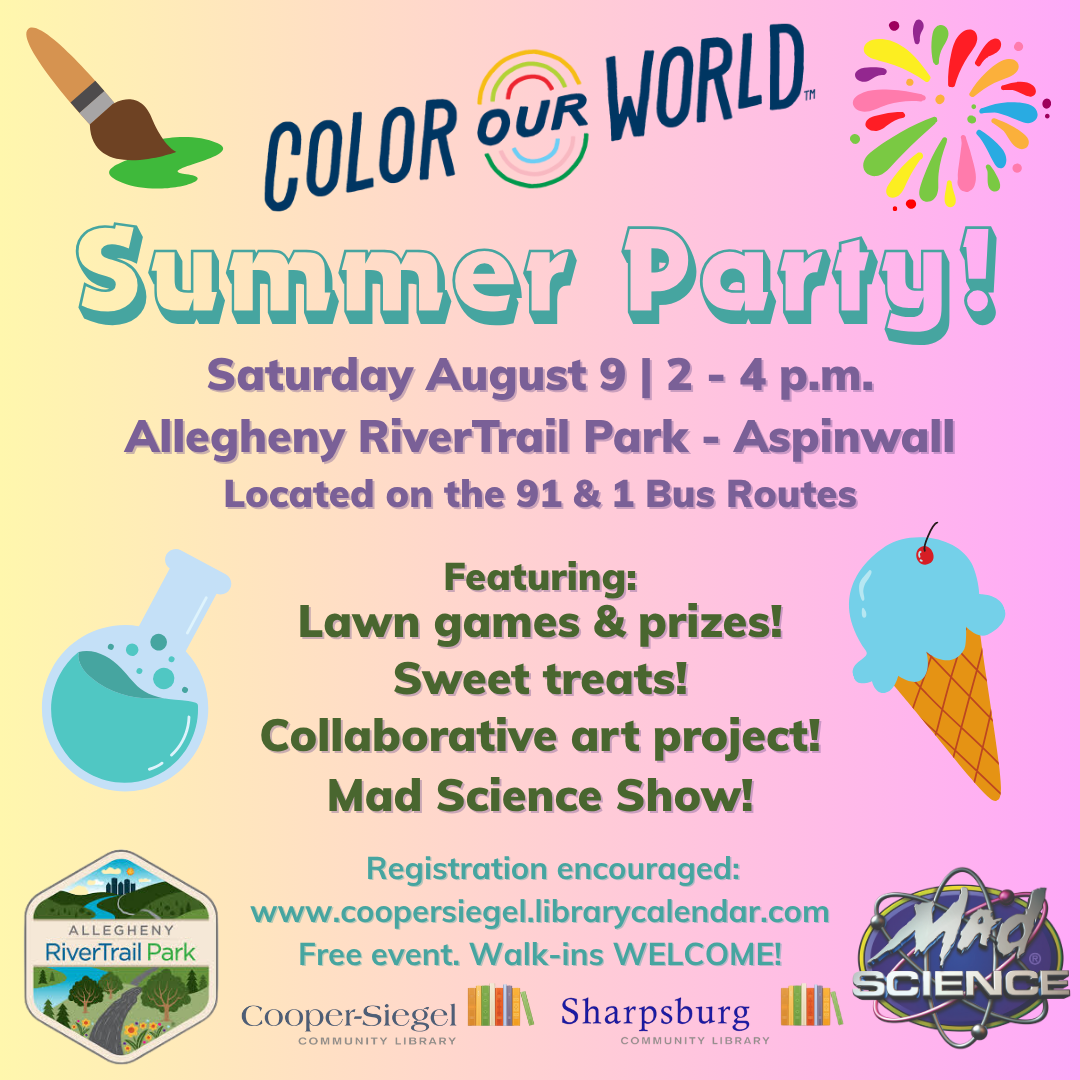 FOX CHAPEL, PA – Cooper-Siegel and Sharpsburg Community Libraries will host their annual Summer Party this Saturday, Aug. 9, at Allegheny RiverTrail Park in Aspinwall. The festivities take place from 2 to 4 p.m. and feature tons of free, family-friendly fun. Cooper-Siegel Community Library (CSCL) Youth Services Department Head Megan Fogt said the event is “a favorite part of summer for many of our families.” “Our libraries love celebrating with our community through this free event for the whole family. We love building connections within our community through our programming, and we hope this provides families with a fun way to engage with each other and our libraries,” Fogt said. “The Allegheny RiverTrail Park in Aspinwall is a fantastic space to host the event, and it’s accessible on the bus lines.” Sharpsburg Community Library (SCL) Branch Manager Sara Mariacher said this year marks the second time the Summer Party will be held at the park, but is the libraries’ fourth joint event overall. “We have the privilege of meeting many of our library patrons and local residents at numerous community events throughout the summer months, but hosting our own Summer Party allows us to celebrate the summer with our communities in our own special way, while also bringing staff from both locations together,” Mariacher said. “Patrons helped us ‘Color Our World’ all summer, and we have some exciting culminating activities, including a collaborative art project and an artful science demonstration from Mad Science!” The Summer Party also serves as the end of the libraries’ “Color Our World” Summer Reading Challenge. The event, which takes place rain or shine, is slated to include: