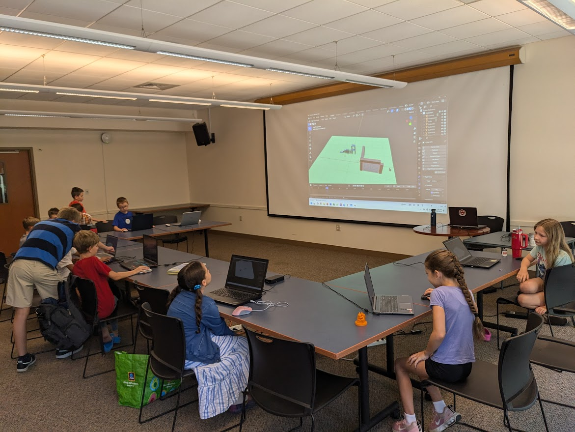 FOX CHAPEL, PA – Chris Wilmer’s animation students may someday create an Academy Award-winning film – if they start early enough. That’s one of the goals of Wilmer’s annual free summer camps at Cooper-Siegel Community Library (CSCL). This year, Wilmer hosted two weeks of beginner and advanced computer animation camps, sponsored by a donation from the Natali Family Foundation. “In both camps, we use the free and open-source software, Blender, to make a variety of images and animations throughout the week,” Wilmer said. “Blender is not a ‘kids’ program.’ It’s used by professionals across a variety of industries, and this year, the movie ‘Flow’ won the Oscar for Best Animated Movie – and it was made in Blender.” In beginner animation camp, students learn the program’s basics and make “pancake monsters,” which are then 3D printed at the library for students to keep. They then learn to animate using physics simulations, including making movies of domino towers getting knocked over. “It’s a hit every year for the kids,” Wilmer said. “In the advanced camp, we focus on more advanced animation and production techniques. Students learn how to animate objects with many interconnected parts – gears, hinges, pulleys, pistons – which we use to create and animate some simple robots.” Advanced campers also learned how to make photorealistic renders with regards to lighting and texturing objects; studied more sophisticated object interactions through physics simulations; and animated destructible buildings and furniture. CSCL Technical Services Department Head and Teen Librarian Brad Wulfkuhle, who oversees the camp’s 3D printing, said Wilmer’s “passion for Blender and computer animation” shines through during camp. “Chris is great. For a teacher that is normally instructing college students, he is able to pivot and teach younger children how to use a program that is challenging for them,” Wulfkuhle said. “It shows his patience and knowledge as an educator. It’s exciting to me watching these kids learn a program where they can be creative and make something unique to their personalities. It’s amazing what they produce after only a week of camp.” Wilmer, a Fox Chapel resident and Toronto, Canada, native, started offering two-day animation workshops at CSCL in 2021, before transitioning to week-long camps the following year with help from his son and fellow animator, William Winerock, 11. “William first acted as my assistant instructor at 7-years-old, and he’s been in that role ever since. He’s been animating for seven years now and even has his own website where he posts some of his animations,” Wilmer said. “When he first started using Blender at age four, I realized that young children were able to pick up this extremely complicated animation software more easily than I would have guessed. When he turned six, I looked around to see if there were any animation camps already out there, and the options seemed very limited, so I started my own. Additionally, I want to be an active member of my community, and this is one way I can contribute.” Wilmer, who holds a Ph.D., works as a chemical engineering professor at the University of Pittsburgh in a lab that designs noses for robots. He’s been teaching graduate students scientific visualization for over 10 years. His native language is Polish, and he enjoys exploring Pittsburgh with his wife, dance historian Emily Winerock. Initially, Wilmer said, he only wanted the CSCL camps to focus on Blender and animation, but added computer literacy concepts to his lessons when he noticed younger generations are “less familiar with computers than their parents are” from growing up using tablets and iPads. “We’ve somehow gone backwards in digital literacy. I routinely get undergraduate engineering students that aren’t familiar with file systems and struggle with using computers,” Wilmer said. “An unexpected benefit of these animation camps is that students are learning to use ‘real’ computers, which is important preparation for doing important work later in their lives.” As for his favorite part of camp, Wilmer said he enjoys the “pancake monster” project, because they display his students’ creativity. “They tend to look equally cute and terrifying, but each has their own unique personality,” he said. “Each monster is made from just combining spheres and cones in different ways, and, in the process, students learn how to make interesting, complex creatures from simple shapes.” Registration for CSCL’s animation camps opens in the spring, and Wulfkuhle said spots fill up quickly. “Any kid that signs up will be able to use Blender to learn something awesome that they can continue to build on as they get older,” Wulfkuhle said. “The camps can definitely be a creative outlet for any kid at any skill level.”